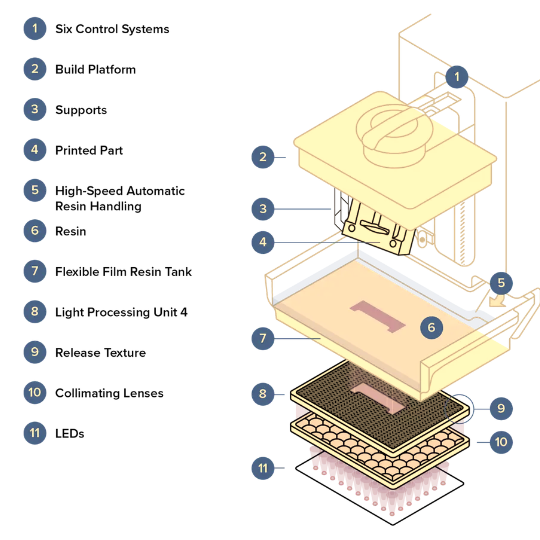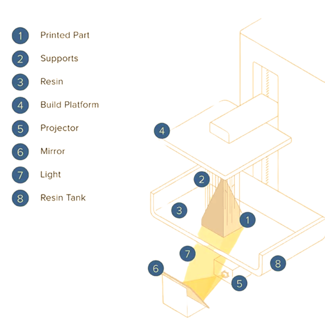 Digital Light Processing (DLP) technology utilizes a digital light projector to cure resin by projecting full-layer images onto the bottom of the vat. This method precisely directs light through a digital micromirror device (DMD), consisting of hundreds of thousands of tiny mirrors.